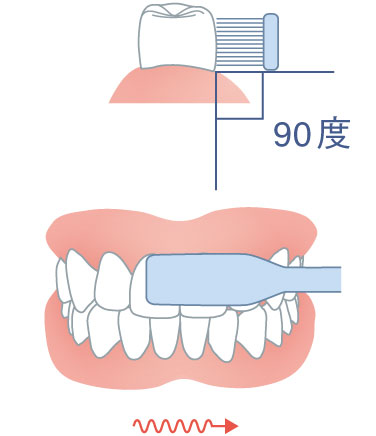 毛先を歯面に90度に当ててみがいた後、退縮した部分に歯ブラシの毛先を45度の角度に当て、歯肉が退縮しているところに合わせ優しい力で、丁寧にみがきます。