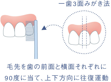 歯ブラシを縦にして上下方向に小刻みに動かし、1本ずつみがきます。 歯ブラシを左右に傾斜させると歯と歯の間に毛先が入りやすくなります。 その際、1本の歯を3面に分けて、それぞれの面に毛先を直角に当てると さらに効果的です。