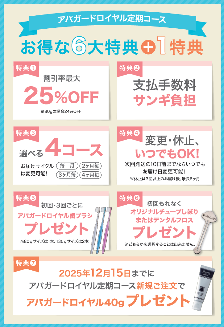 - 初回お届け時にアパガードオリジナルチューブ絞り 又はデンタルフロスプレゼント